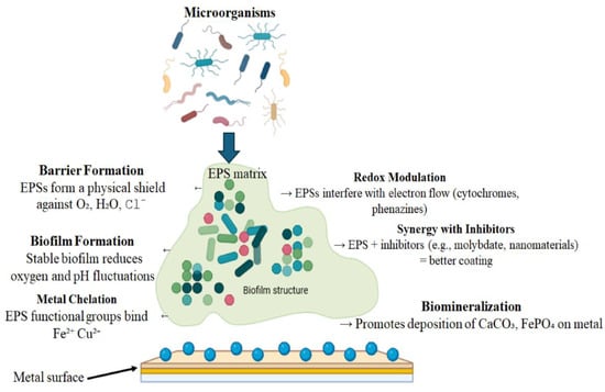 Schematic overview of EPS-mediated metal corrosion inhibition mechanisms.
