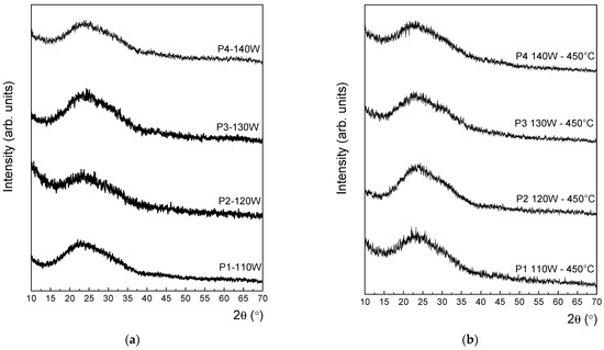 The XRD investigation of as-deposited and thermally treated films shows signs of a slight structural evolution in the as-deposited films after the thermal treatment, but they remained amorphous, as can be observed in Figure 1a,b.