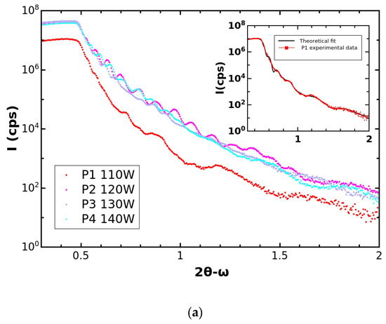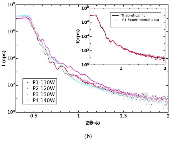 The AlN thin films were deposited with a sputtering time of 3 h, with the target-to-substrate distance fixed at 5 cm. For each deposition configuration, the sputtering power was varied between 110 W and 140 W, in 10 W steps. In such a manner, four samples, denoted as AlN110, AlN120, AlN130, and AlN140, were prepared. Post-deposition annealing was conducted at 450 °C for 30 min under a nitrogen flow (1.2–1.4 L/min). This annealing temperature was chosen to induce surface and structural reorganization without triggering crystallization, which typically requires significantly higher temperatures. Nitrogen was used as a protective inert atmosphere to prevent film oxidation and maintain stoichiometry. Although molecular nitrogen has limited reactivity at moderate temperatures, it ensures stable and reproducible conditions and is widely adopted in thin-film processing. The XRD measurements were performed using a Rigaku Smart Lab X-Ray diffractometer [27,28] with a HyPix-3000 detector and a Cu anode (λKα = 1.5418 Å) at a maximum power of 9 kW. The films thicknesses were obtained from XRR together with roughness’s of the films as determined via optical profilometry. The XRR scans were performed using the Rigaku SmartLab X-Ray diffractometer [27,28], with a 9 kW rotating Cu anode, in parallel beam (PB) mode, with a Ge220x2 monochromator, using an open detector configuration in 0D scanning mode, at a speed of 0.5°/min with steps of 0.0024°.