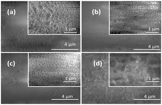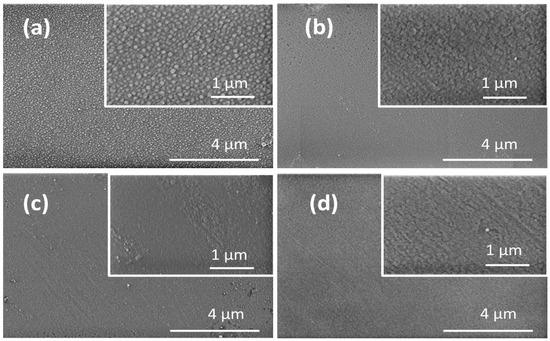 SEM micrographs of the thermally treated AlN films deposited on SiO2 substrates, indicating the evolution of the surface morphology after annealing for different RF source powers: 110 W (a), 120 W (b), 130 W (c), and 140 W (d). All samples were thermally treated at 450 °C.