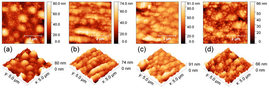 AFM surface morphology (upper row) and 3D topography (lower row) of the AlN films deposited on the SiO2 substrates at different powers, i.e., 110 W (a), 120 W (b), 130 W (c), and 140 W (d), and thermally treated at 450 °C. The scanned area was 5 × 5 μm2.
