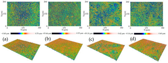 Optical profilometry analysis data of the AlN films after thermal treatment at 450 °C, deposited at different RF powers: (a) 110 W, (b) 120 W, (c) 130 W, and (d) 140 W. The scanned area was 264 × 350 μm2.