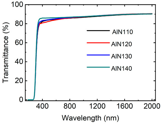 The optical properties of AlN thin films were examined using transmission spectroscopy and SE. Transmission spectra (Figure 9) showed high transparency (>80%) in the 700–2000 nm range across all samples, with a gradual decrease below 700 nm. No distinct interference fringes were observed, consistent with moderate roughness and small thickness gradients across the samples. These results confirm that all AlN films exhibit excellent NIR transparency, making them viable candidates for dielectric and transparent optoelectronic layers. As the bandgap of crystalline AlN lies around 6.0–6.2 eV, the absorption edge is expected below 210 nm—outside the measured spectral range—preventing direct bandgap estimation from transmission data.