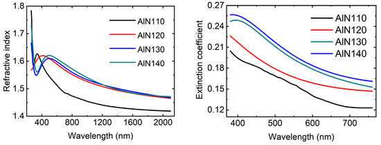 The constructed optical model was a four-layer model, consisting of air/roughness layer (AlN + void)/AlN layer/SiO2 substrate, while the dispersion model chosen for fitting the ellipsometric spectra was the Adachi–New Forouhi (ANF) model [31]. Spectra of refractive indices (n) and extinction coefficients (k) of the sputtered AlN thin films are shown in Figure 10.