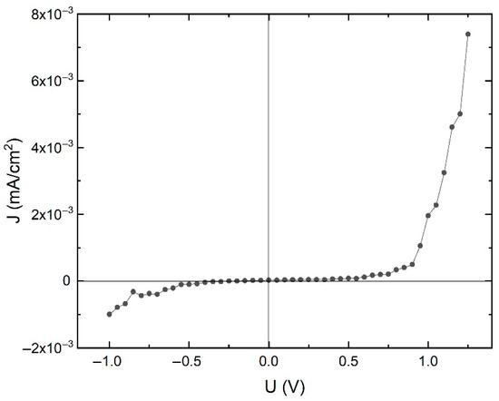 To investigate the electrical behavior of the AlN films, we fabricated a vertical Au/AlN/Al structure using the film deposited at 140 W. Figure 11 shows the dark current density–voltage (J–U) characteristics measured at room temperature. The curve exhibits rectifying behavior, with a relatively low asymmetry. The rectifying ratio, defined here as the absolute value of forward to reverse current densities at ±1.2 V, |J+/J−| ≈ 10, confirms diode-like response under low-bias conditions.
