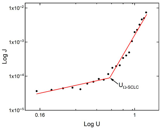 Figure 12 shows the logarithmic J–U plot under forward bias. Two conduction regimes are observed: (1) Ohmic region at low voltages (slope ≈ 1), where the current increases linearly with applied voltage, indicating drift transport of thermally generated carriers described by Ohm’s law: