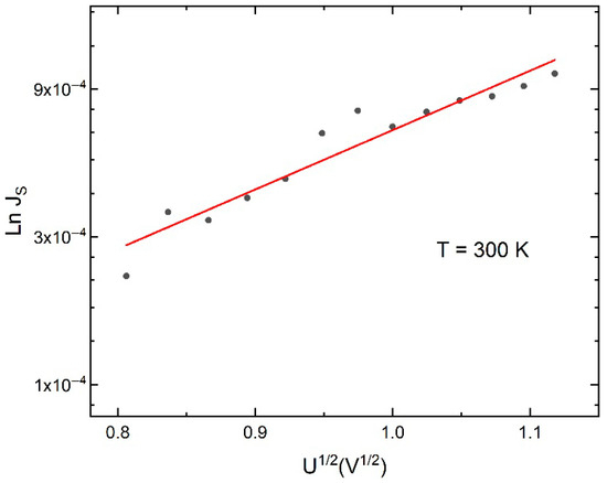 Under reverse bias (Figure 13), the current follows the Schottky emission model. The plot of ln(J) versus U1/2 confirms barrier-limited conduction. The current density through the structure is described by the law