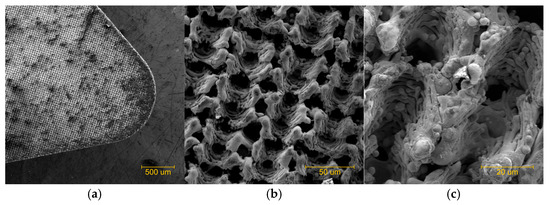 Figure 3 shows burrs along the channel edges and a layer of resolidified material deposited over the textured surface. Despite these superficial irregularities, the underlying pattern geometry remains intact and conforms to the intended design. The excess material and burrs will be eliminated in a subsequent chemical treatment step, fully restoring the original texture.
