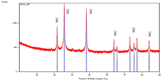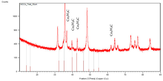 Excessively long or intense texturing processes can lead to the formation of undesirable phases, such as oxides or intermediate carbides, compromising the quality of the deposited diamond film, as reported in the literature [13,14]. Therefore, XRD analysis of the samples (Figure 4) was performed and compared with the reference standard composed of tungsten carbide (Figure 5), revealing small additional peaks of cobalt tungsten carbide (Co3W3C). This indicates that the material’s chemical composition and atomic organization remained stable.