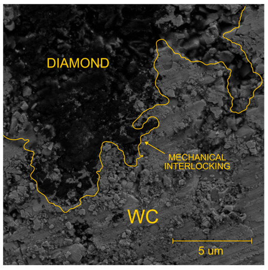 Cross-section of the diamond film with detail of the mechanical interlocking at the interface of diamond with WC-Co.