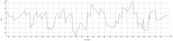 The surface roughness characterization (Ra = 11.55 µm), as shown in Figure 9 of the diamond film, reveals a compromise between adhesion and functional performance. While the underlying pyramidal texturing favors mechanical anchoring of the coating, the long deposition time results in roughness values higher than ideal for fine finishing operations (for example, 0.4–1.6 µm, 0.4–1.6 µm). This characteristic limits the film’s application to contexts where surface finish requirements prevail over wear resistance.