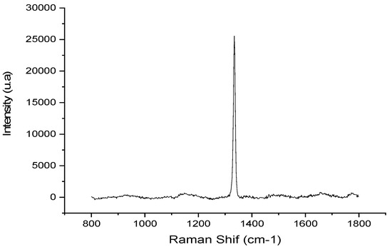 Raman spectroscopy analysis, performed using a LabRAM HR Evolution system, confirmed the high crystalline quality of the diamond film, evidenced by the characteristic peak at 1334.45 cm⁻1, as shown in Figure 10, corresponding to the sp3 carbon hybridization in the diamond structure. The narrow and intense peak indicates high material purity and crystallinity, with its width reflecting the uniform size of crystalline grains. Application of the Ager and Drory equation [15] revealed compressive residual stresses of −1.389 GPa, demonstrating the effectiveness of pyramidal texturing in promoting homogeneous growth, as evidenced by the low stress value dispersion and, also, by the absence of peaks associated with amorphous or graphitic structure.