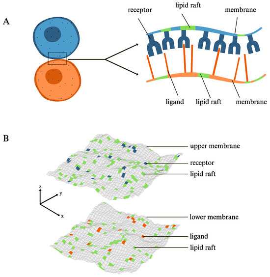 Adhesion-induced phase separation within bio-membranes has been studied both theoretically [19] and experimentally [20,21] in many distinct contexts. For example, adhesion of multi-component membranes to chemically patterned surfaces has been shown to induce phase separation within the membranes under suitable conditions [22]. Interplay between specific attractive and generic repulsive interactions between the apposing membranes has been shown to be sufficient to cause lateral phase separation [23]. Adhesion-induced phase separation has been shown to occur in membranes containing several types of receptor and ligand molecules of different lengths [24,25], and also in membranes with only one type of receptor and ligand, provided that direct receptor–receptor or ligand–ligand attraction is sufficiently strong [26]. Other recent studies on adhesion-induced phase separation [9,10,27,28] have focused on yet a different type of system, namely, membranes in which the receptor and ligand molecules exhibit affinity for lipid rafts, as illustrated in the cartoon in Figure 1A. The latter studies have been motivated by evidence that association of cell adhesion receptors with lipid rafts is a common and biologically relevant process—especially in the context of immune system cells—as it has been reported in experiments both in vitro and in vivo [29,30,31].