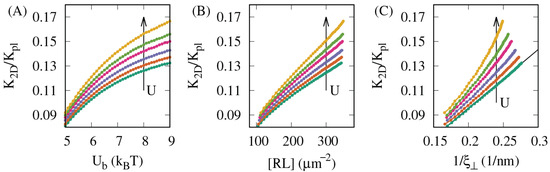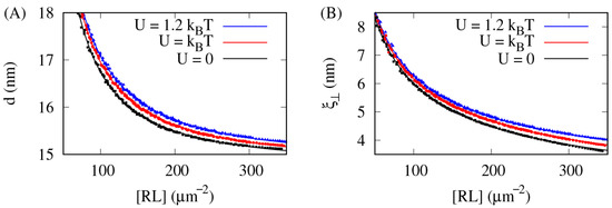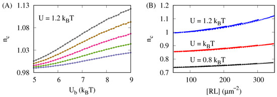 The data in Figure 2B show that increases monotonically with the area concentration [RL] of receptor–ligand complexes, which indicates a positive cooperativity in the process of the receptor–ligand binding. This cooperativity results from supersession of membrane fluctuations upon membrane adhesion [11,18]. Importantly, Figure 2B also shows that the increase in with [RL] becomes steeper as the raft–raft contact energy U is increased. Therefore, the local attraction between lipid rafts increases the degree of cooperativity of the receptor–ligand binding.