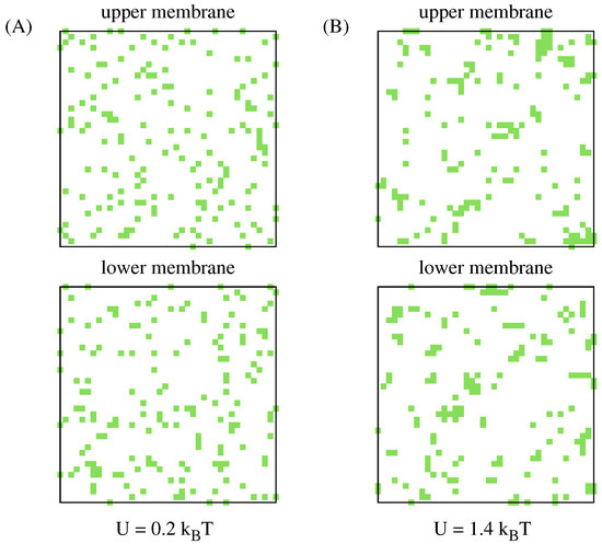Taken together, the data shown in Figure 3 demonstrate that both the average inter-membrane distance d and the membrane roughness grow as the raft–raft contact energy U is increased, which may give the impression that the adhesion of the membranes becomes weaker as the attraction between lipid rafts is increased, which in turn is seemingly in contradiction with the data shown in Figure 2 that demonstrate that both the affinity and cooperativity of the receptor–ligand binding are actually elevated as the attraction between lipid rafts is increased. In order to explain this apparent discrepancy between the data shown in Figure 2 and Figure 3, it is useful to determine how lipid rafts and raft-associated proteins are distributed within the membranes, as discussed in the following paragraphs.