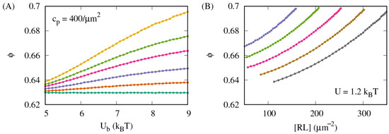 Figure 2 shows the results of MC simulations with the area concentration of adhesion proteins m2 and the fraction of the membrane area covered by lipid rafts . The data points in different colors correspond to different values of the raft–raft contact energy U, ranging from 0 to 1.2 . It can be seen in Figure 2 that , which means that thermal fluctuations of the adhered membranes weaken the receptor–ligand binding. This effect can be attributed to the fact that the local distance between the thermally fluctuating membranes is in the range suitable for the receptor–ligand binding only with a certain probability smaller than 1 [16].