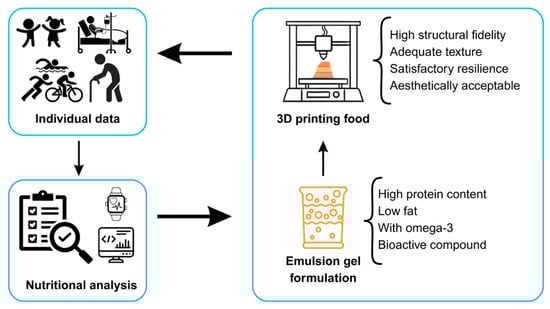 Figure 1 illustrates the integrated flow of developing personalized foods through 3D printing using emulsified gels as a functional base. To develop personalized foods, it is first necessary to collect individual data (from children, elderly people, athletes, clinical patients, and others) and analyze it using monitoring technologies and digital platforms, such as smartwatches and specialized software. Based on this analysis, a personalized nutritional diagnosis is conducted, which guides the ideal composition of food for each profile. Therefore, the formulation of the emulsified gel is adjusted according to nutritional needs, such as high protein content, low fat content, and addition of omega-3 and bioactive compounds, among others. The 3D-printed formulated gel generates a food in which the desired characteristics, such as high structural fidelity, adequate texture (cohesive and soft), good resilience, and satisfactory aesthetic appearance, are obtained. This approach represents the convergence of food technology, nutritional personalization, and bioengineering, aimed at populations with specific dietary requirements.