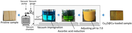 The preparation processes of Cu2O@Cu-loaded woods and bamboo are illustrated in Figure 1. Raw wood and bamboo specimens were washed thoroughly with DI water and vacuum-dried at 80 °C for 24 h. Then, pristine samples were immersed into a Cu (NO3)2 solution (100 mL and 0.5 mol/L) and kept in a vacuum chamber with a pressure of 10 Pa for 24 h. After the addition of an ascorbic acid solution (20 mL and 5.0 mol/L) for 2 h, the solution pH value was adjusted to 7.0 using negligible amounts of NaOH solution, and the solution was stirred continuously for 1 h. As-prepared samples were rinsed using DI water and dried at 80 °C for 12 h. The obtained products were termed as Cu2O@Cu/PW, Cu2O@Cu/BW, Cu2O@Cu/OW, and Cu2O@Cu/bamboo, respectively.