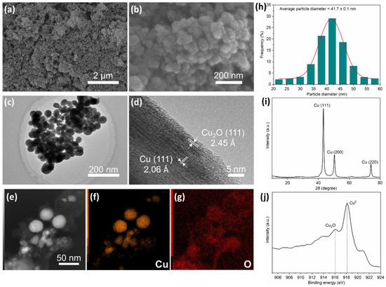 SEM images (a,b) and TEM images (c,d) of Cu2O@Cu aggregates. EDS mapping images (e–g). Distribution of particle diameter (h). XRD pattern (i). Cu LMM spectrum (j).