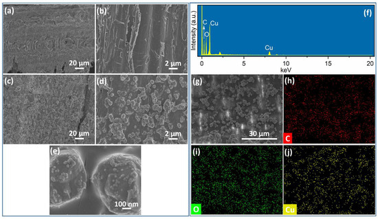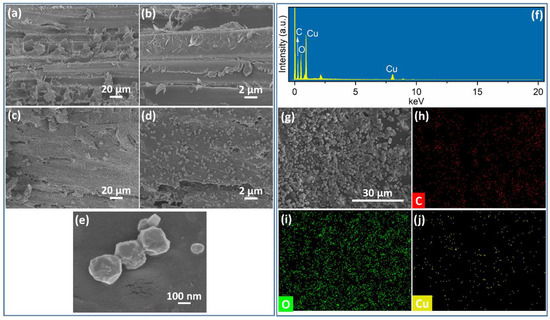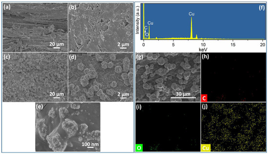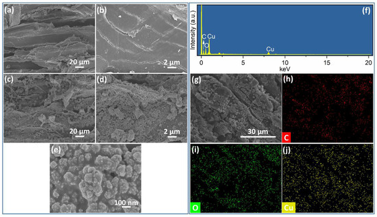 SEM images of bamboo (a,b) and Cu2O@Cu/bamboo (c–e). EDX spectrum (f) and mapping images (g–j) of Cu2O@Cu/bamboo.