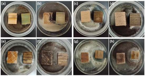 Digital photos of PW and Cu2O@Cu/PW (a,b), BW and Cu2O@Cu/BW (c,d), OW and Cu2O@Cu/OW (e,f), and bamboo and Cu2O@Cu/bamboo (g,h) after 7 days and 28 days of mold growth.