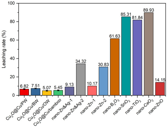 Since nano anti-mold agents loaded on the surface of woods or bamboos are highly leachable because of their water-borne characteristic and nanoscale size, it is necessary to evaluate the leaching behavior of Cu2O@Cu-loaded woods and bamboo during the applications. The leaching rates of Cu2O@Cu-loaded woods and bamboo were 6.82% for Cu2O@Cu/PW, 7.51% for Cu2O@Cu/BW, 5.07% for Cu2O@Cu/OW, and 5.45% for Cu2O@Cu/bamboo (Figure 9). The leaching rate presented a monotonically positive relation with the atomic content of Cu loaded on the surface of these four samples. Wood with a higher porosity would provide more surface-available sites for the capture of Cu2O@Cu aggregates, inducing more agglomerates of Cu2O@Cu aggregates on the surfaces of PW and BW due to the van der Waals forces. However, larger agglomerates would present weaker adhesion of Cu2O@Cu aggregates to the surface of specimens. Thus, Cu2O@Cu/PW and Cu2O@Cu/BW with larger agglomerate sizes would release more Cu2O@Cu aggregates. All experimental data were the averages of triplicate determinations, and the relative errors of the data were less than 5.0%. The standard deviations of the leaching rate were 0.408 for Cu2O@Cu/PW, 0.227 for Cu2O@Cu/BW, 0.468 for Cu2O@Cu/OW, and 0.413 for Cu2O@Cu/bamboo.