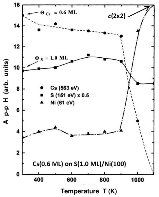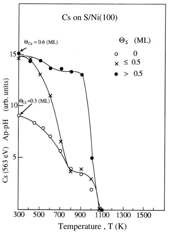The Ap-pH of Cs (563 eV) AETL for ΘCs = 0.3 ML on the clean Ni(100) surface and ΘCs = 0.6 ML on S-covered Ni(100) surfaces for ΘS ≤ 0.5 ML and ΘS > 0.5 ML, as a function of temperature of the sample post-annealing. The Auger electron signal was recorded when the sample’s temperature was restored to close RT.