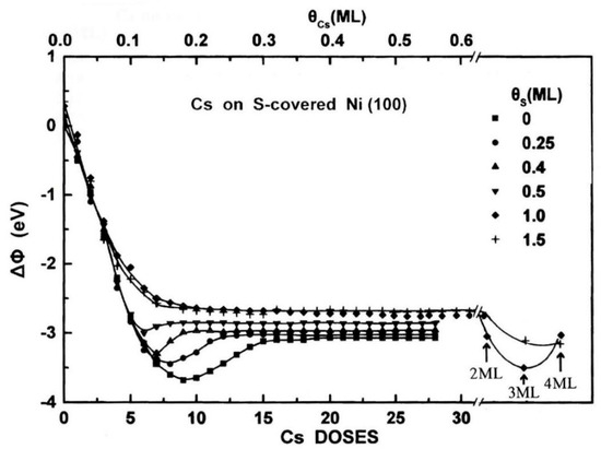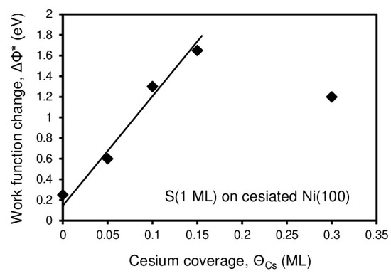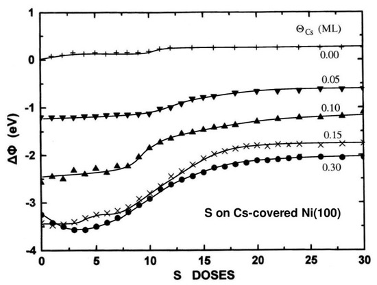 In Figure 3, the WF change ΔΦ is shown as a function of Cs deposition on the clean surface and the Ni(100) surface pre-covered with different amounts of sulfur. For Cs on clean Ni(100), the WF curve shows the very well-known characteristic curve observed with cesium on several surfaces [23,24,25,51,52,53]. According to the electrostatic image model [54,55,56], the initially drastic and almost linear WF decrease is due to the initial dipole moment of the Cs adatoms “pointing outward” from the surface, because of their electropositive nature. Therefore, the initially isolated chemisorbed Cs adatoms on the nickel surface are expected to be in an ionic state, while as the coverage increases, the interaction between the dipoles induces depolarization effects, first leading the WF to a minimum and finally leveling it off to a higher value (see plateau in Figure 3). At that final stage of adsorption, the interaction between the Cs adatoms prevails over that with the substrate, resulting in the metallization of cesium overlayer.