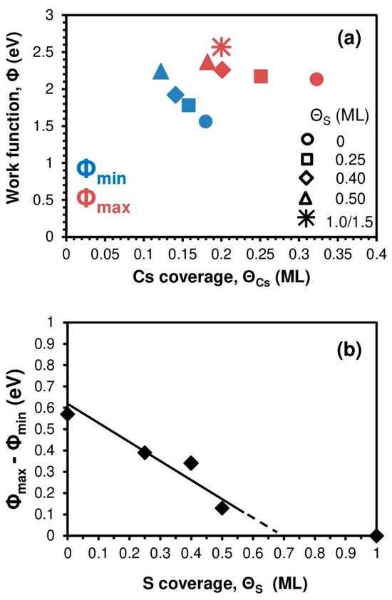 The shape of the WF curve described above, however, is gradually modified as the coverage of the pre-deposited S increases. The significant noticed modifications are the following: (a) The WF minimum Φmin shifts to lower ΘCs and its value increases. (b) The value of the final WF Φmax (maximum value at the formed plateaus in curves in Figure 3) also shifts to lower ΘCs and increases. (c) Above Θs = 0.5 ML, the WF curve does not show any minimum, but simply levels off to a final plateau. (d) For much higher Cs coverages (ΘCs > 1 ML) and Θs = 1 ML, the WF decreases to a minimum value for ΘCs = 3.0 ML and subsequently increases at ΘCs = 4.0 ML. A similar WF minimum, however, is not recorded for higher pre-deposited S quantity (Θs = 1.5 ML). By considering the WF of the clean Ni(100) equal to 5.2 eV [22,57], we present in Table 2 some numerical data for the WF based on the above reported modifications. In addition, for more clarity, Figure 4 depicts some of these data with regards to Φmin and Φmax as a function of the Cs coverage on different sulfured Ni(100) surfaces (Figure 4a) and the difference of Φmax − Φmin as a function of the S coverage (Figure 4b).
