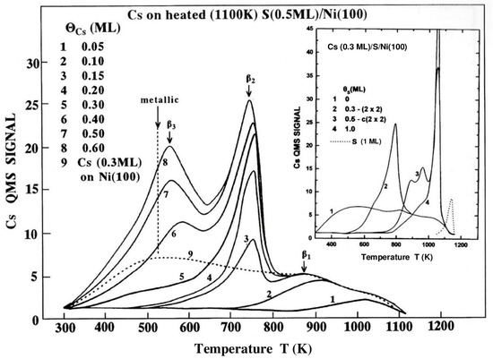 The desorption energy of β2 being lower than that of β1 designates a lower binding energy of Cs than the initial one, which rules within a coverage range of 0.1 ML < ΘCs < 0.3 ML. This new β2 adsorption state is probably due to a lower degree of ionicity in the Cs adatoms as ΘCs increases. In addition, the observed c(2 × 2) surface structure suggests that Cs interacts mostly with Ni at that stage of absorption. As ΘCs increases further (ΘCs > 0.3 ML) and the second Cs physical layer starts to grow, the third adsorption state β3 of much lower binding energy develops on the surface and approaches the desorption state of the metallic state depicted with a vertical arrow and dashed line (see curve 9 in the main Figure 5). Indeed, it is well-known that the first physical layer of Cs on the clean Ni(100) surface is in a metallic state [41].