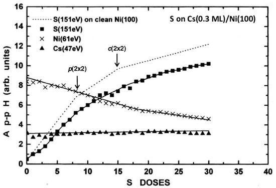Figure 6 shows the Ap-pH of S (151 eV), Ni (61 eV) and Cs (47 eV) AETLs as a function of S deposition on the Cs(0.3 ML)/Ni(100) surface. For comparison reasons, we also show the evolution of the S (151 eV) Ap-pH on clean Ni(100) with a dashed line and the corresponding appearing LEED patterns. The initial slope of the S (151 eV) AETL curve on cesiated Ni(100) is lower than that of the clean substrate surface. This is attributed to the masking effect due to the submergence of the initially deposited S atoms under the Cs layer. With increasing adsorption of S, however, the slope of the sulfur Ap-pH curve increases too, but for coverages above 0.25 ML of S (~7.5 D), the slope of the curve decreases gradually. On the other hand, the Cs (47 eV) Ap-pH does not substantially change versus S coverage. In contrast, the intensity of the Ni (61 eV) Ap-pH decreases substantially during S deposition. The above-described behavior of the three elements’ Ap-pHs supports that adsorbed S atoms are not relaxed on top of the Cs layer but immediately diffuse in to be bound directly to the Ni substrate under and in between the pre-deposited Cs atoms, thus giving the same sulfur structures, p(2 × 2) and c(2 × 2), as in the case of S adsorption on clean Ni(100). This sulfur’s atom arrangement in combination with the almost double and a half times bigger atomic size of Cs is expected to eliminate the masking effect, keeping the intensity of the Cs (47 eV) Ap-pH almost constant.
