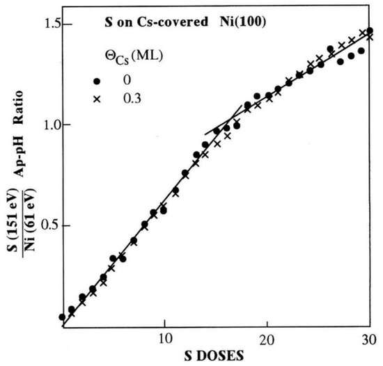 The Ap-pH ratio of the of S (151 eV)/Ni (61 eV) AETLs during S deposition on the clean and the Cs(0.3 ML)/Ni(100) surface.