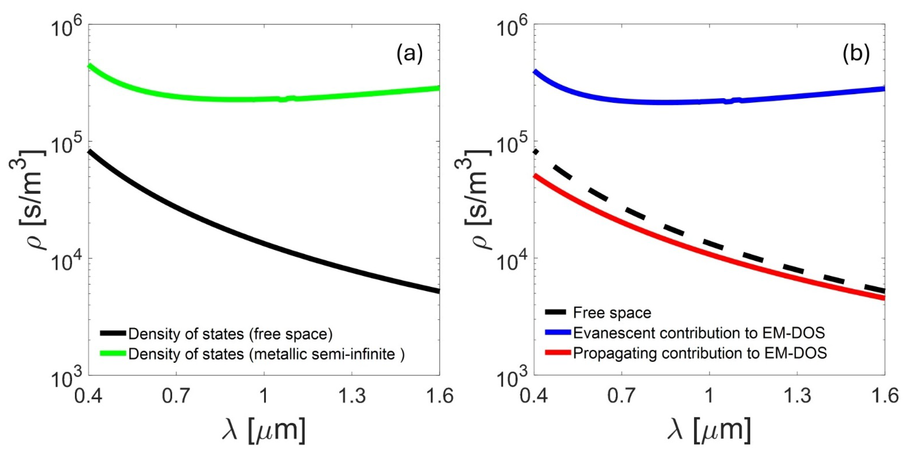 c the speed of light in free space. However, two contributions of electromagnetic modes, propagating and evanescent modes, describe the EM-DOS. Both propagating and evanescent modes play a fundamental role in shaping the EM-DOS and determining how light–matter interactions occur in nanoscale structures and interfaces. EM-DOS is essential in studying light–matter interactions at the nanoscale, contributing to advancements in nanophotonics applications such as enhanced emission and absorption, nanoantennas and metasurfaces, and single-photon sources. However, in the simplest case, a metallic–dielectric interface (