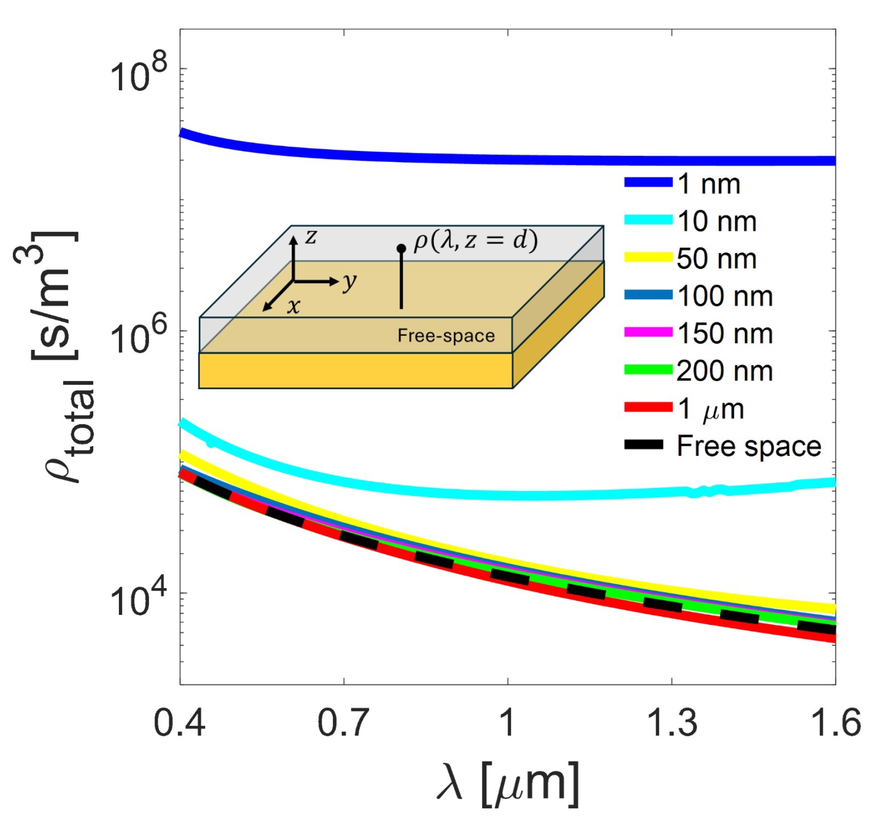 Figure 2 shows EM-DOS in a free space and a metallic (Au) semi-infinite surface across VIS and IR wavelengths.