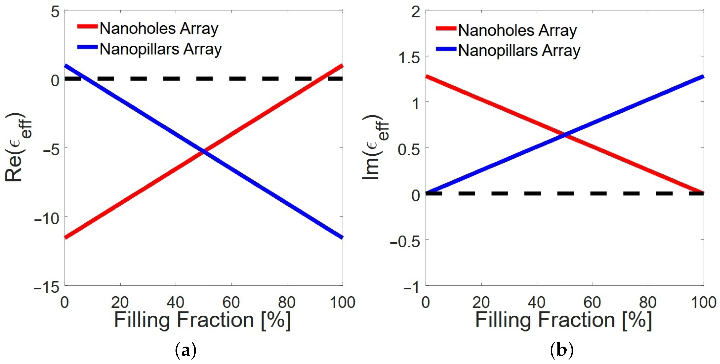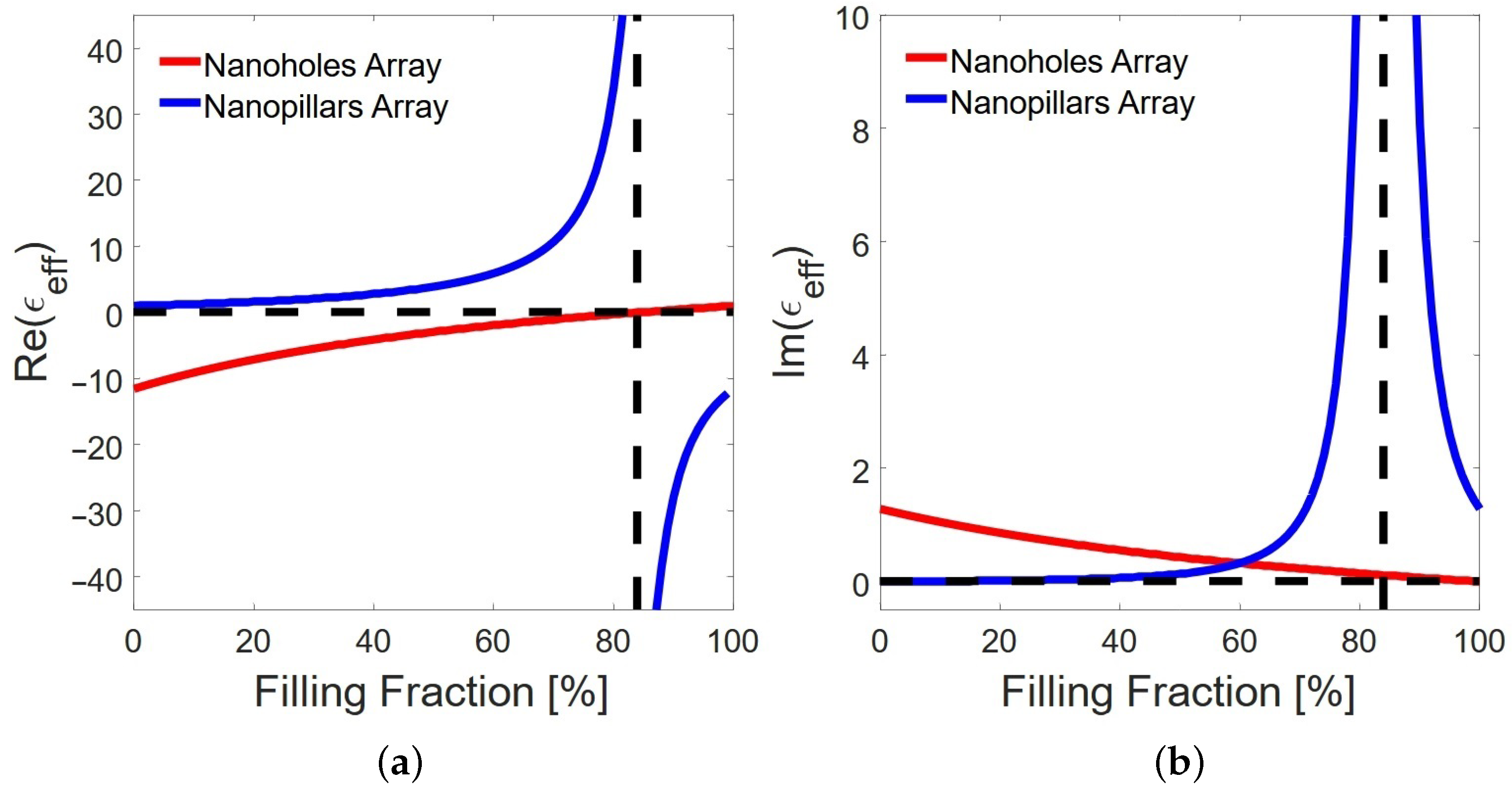 Figure 5a, we observe that the nanohole array shows zero permittivity at a filling fraction of 85% because the high density of nanoholes disrupts the continuity of the metal. This phenomenon is linked to the Extraordinary Optical Transmission effect, where the nanoholes allow enhanced transmission of light through the metal film. A nanopillar array, in turn, exhibits a pole in permittivity at a similar filling fraction, around 85%, for