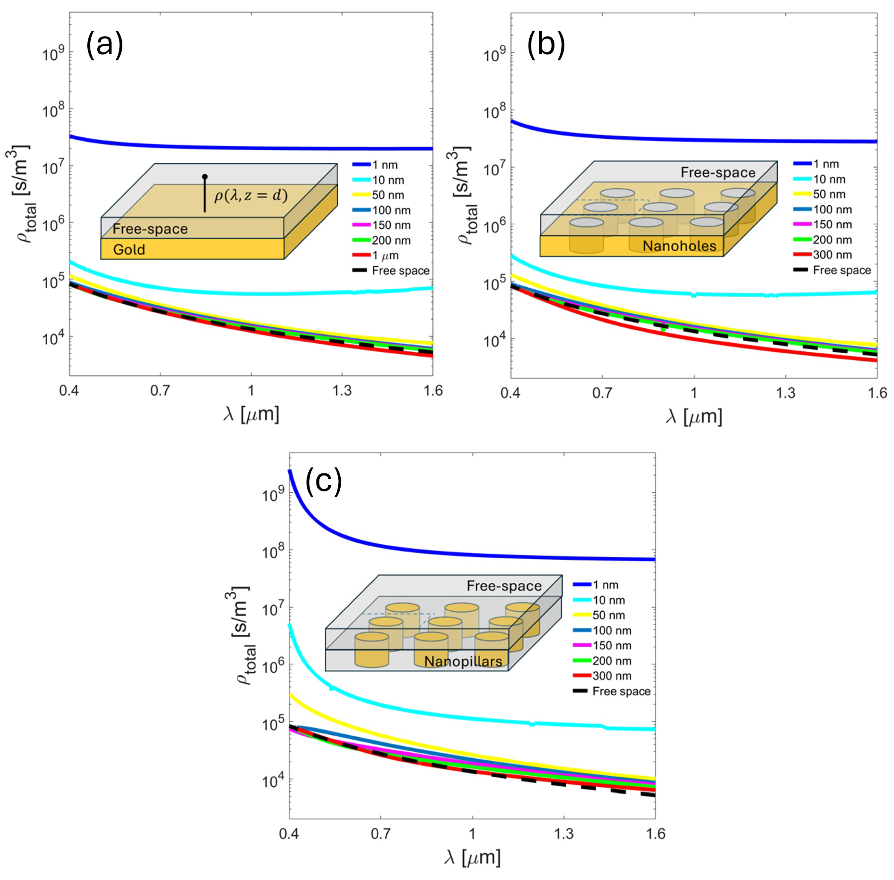 Figure 7 shows the EM-DOS for a punctual source at different distances above the surface for different plasmonic structures at different distances. The filling fraction was set to 30% for nanohole and nanopillar arrays. The EM-DOS spectrum for a QE placed 1 nm from different gold nanostructures (flat semi-infinite medium, nanohole array, and nanopillar array) in the range from 400 nm to 1600 nm exhibit distinct behaviors due to the unique interactions with each structure. EM-DOS at 1 nm from the interface is more significant than nanopillar arrays at shorter wavelengths compared to a semi-infinite metallic plane and nanohole arrays. These structures support various resonant modes, including Mie and guided mode resonances. These resonances can significantly enhance the local electromagnetic fields, leading to a higher EM-DOS. The shape and size of the nanopillars can be optimized to resonate at specific wavelengths within the visible spectrum. When the periodicity of a nanostructure matches the wavelength of the incident light, surface lattice resonance modes emerge, leading to a significant enhancement of EM-DOS [