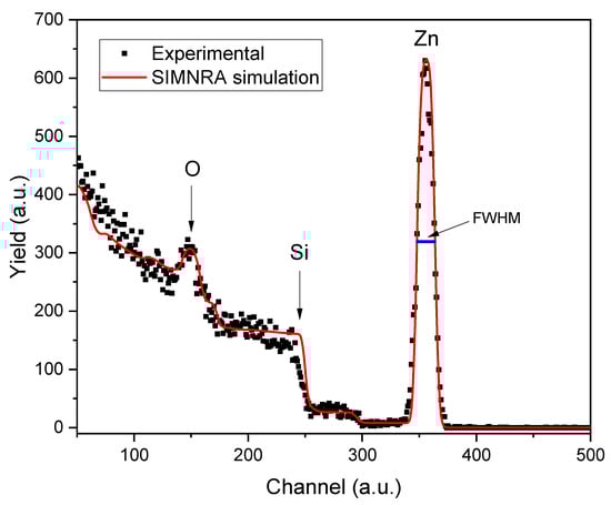 Once the ZnO film was deposited on the Borosilicate glass substrate, we determined the film thickness using the Rutherford Backscattering Spectrometry (RBS) technique [21,22]. The measurement was performed using the 3 MV Pelletron-type accelerator (NEC 9SDH-2, National Electrostatics Corporation, Middleton, WI, USA) at the Physics Institute of the National Autonomous University of Mexico (UNAM), with a 2.5 MeV alpha beam used as the projectile. Alpha particles collide with the sample and scatter at an angle of 167° before being detected by a surface barrier detector. A multichannel analyzer processes the analog signals produced by the system to create the Rutherford Backscattering spectrum. In this spectrum, the target element is identified by the energy of the backscattered particles resulting from specific reactions between the incident ions and the target element. Figure 1 displays the RBS spectrum of the ZnO thin film, highlighting the elements that compose the material.