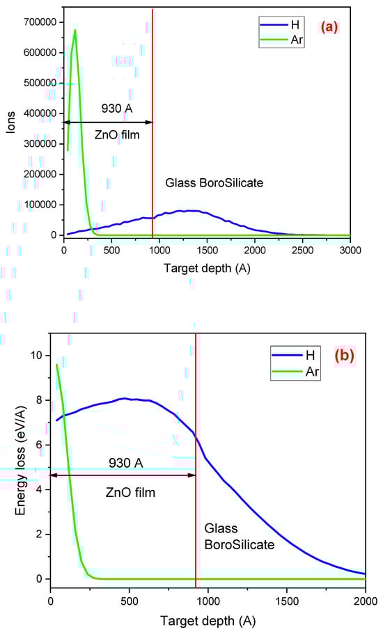 Figure 2a depicts the distribution of H (blue curve) and Ar (green curve) ions when they interact with the material composed of a 93 ± 5 nm ZnO layer and a glass borosilicate substrate. The distinct values of electronic and nuclear energy loss for H+ and Ar+ ions lead to their different behavior. We observed that some H+ ions remain implanted in the film when they interact with Zn or O atoms, while the rest pass through the ZnO and stop in the substrate. In the case of Ar ion interaction with the material, the scene is different. Due to their higher mass, Ar ions lose more energy when interacting with the elements that compose the film and come to a complete stop within it at 300 Å. On the other hand, the H+ ions pass through the film and stop inside the substrate at 2200 Å. The implications of these stopping points are significant, as they can influence the performance of materials in various applications.