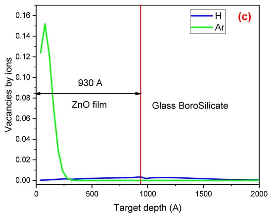 SRIM simulations. (a) H and Ar atom concentrations in the ZnO thin film, (b) the electronic energy loss (ionization events), and (c) the nuclear energy loss (vacancies and defects).
