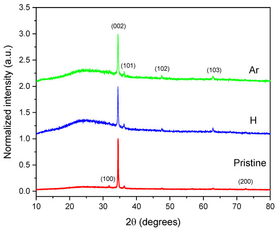 According to JCPDS data (File 36-1451) [35], the lattice constants for ZnO are a = 3.2498 Å and c = 5.2066 Å, with a c/a ratio of 1.60. The data presented in Table 2 indicate slight variations in the lattice parameters a and c for the irradiated samples. The increase in the c/a ratio suggests an expansion of the crystalline structure due to the incorporation of H and Ar atoms into the hexagonal structure, as has been observed by Kim et al. [36] and Bharati et al. [37].