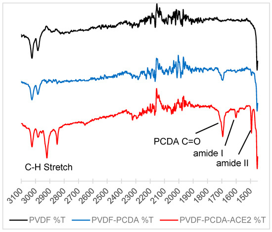 The most common method for derivatizing PCDA for sensing applications is the conversion of the compound into its NHS ester derivative after an initial reaction with EDC. The NHS group is easily displaced by a nucleophilic primary amine, such as those found in many proteins and antibodies. While the probes could be attached to the PCDA at the monomer stage, this was avoided as large headgroups could disrupt the organization of the DAs when deposited on the substrate. The UV irradiation required to trigger the polymerization had the potential to degrade the probe antibody in such cases. Instead, a mixture of PCDA and PCDA-NHS in a 95:5 ratio was deposited, followed by irradiation. The probe conjugation was then performed on the PVDF-pDA surface. The process was monitored by FT-IR (Figure 2). Introduction of PCDA showed a carbonyl stretch around 1700 cm−1 for the PCDA carboxylic acid. The ACE2 product shows the amide I and II bands at ~1600 and 1490 cm−1, respectively.