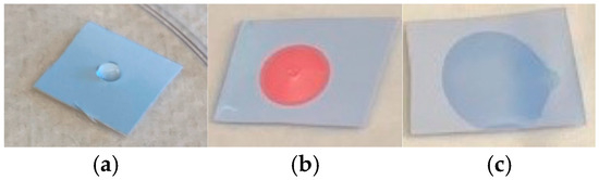 The candidate substrates, particularly PVDF, were very hydrophobic, resulting in a poor interaction between aqueous proteins and the sensing probes. Figure 3a shows how a drop of DI water beads up on a pDA/PVDF surface. A 10% solution of Triton-X (Figure 3b) reduced the contact angle but triggered a sensor color change. However, reducing the Triton-X concentration to 0.01% still allowed for sufficient wetting of the substrate without causing the color change (Figure 3c). Thus, the addition of surfactants in small amounts was found to be important for the best sensor performance. Figure 4 shows the performance of a PVDF-pDA substrate coupled to the antibody of the SARS-CoV-2 nucleocapsid protein (N-protein). The nucleocapsid protein is the most conserved and abundant component of the SARS-CoV-2 viral particle, though it is not expressed on the virus surface. Here, the sensor was dipped in a dilute aqueous solution 0.01% of TritonX. This was then rinsed with DI water before being exposed to a drop of a solution containing 10 µL of the N-protein in PBS. This resulted in the triggering of the sensor. Without the surfactant, the solution only poorly wetted the sensor surface, and the color change was minimal (Figure 4c). The addition of the surfactant to the N-protein solution also allowed for good wetting of the surface and an excellent color change (Figure 4d). The color change was apparent after 1 min, with the color shift becoming greater after 90 s.