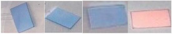 Photographs of various substrate materials soaked in a DCM solution of PCDA for 60 s, dried, and photolyzed by UV light for 60 s with a 90° rotation every 15 s.