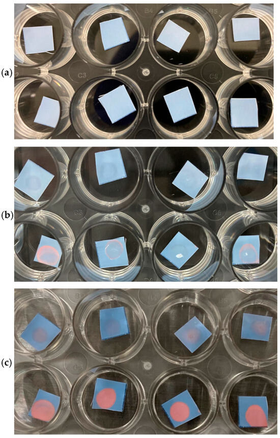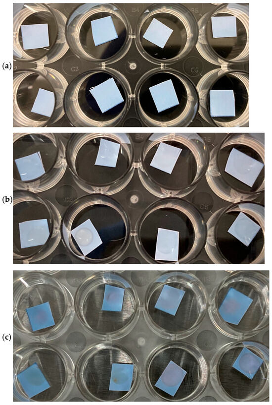 Three pDA/PVDF sensors exposed to (a) DI water, (b) 10% Triton-X solution, and (c) 0.01% Triton-X solution.