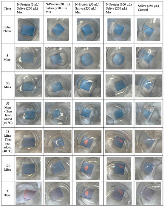 The PVDF-pDA-N-Antibody membranes tested against live virus were unresponsive and did not initiate a color change once exposed to the saliva samples, as expected, due to the inability to access the N-protein entrapped within the viral particles. However, the PVDF-pDA-N-Antibody membranes should have initiated a color change once exposed to the inactive viral samples, as the N-protein would be accessible, yet only slight color changes were observed. A possible reason why the N-protein membrane sensors did not initiate color changes once exposed to the virus was that additional components of the saliva samples inhibited the conjugated antibodies from recognizing the desired targets (i.e., N-proteins). To evaluate this possibility, the PVDF-pDA-N-Antibody membranes were tested against N-protein alone, N-protein plus a surfactant, N-protein plus COVID-19-negative saliva, an N-protein saliva mix, and controls. The PVDF-pDA-N-Antibody membranes were responsive to the N-protein, as we witnessed the desired color change in all the samples tested against the protein, whereas little to no color changes were observed in the controls tested against only a surfactant or saliva (Figure 9).
