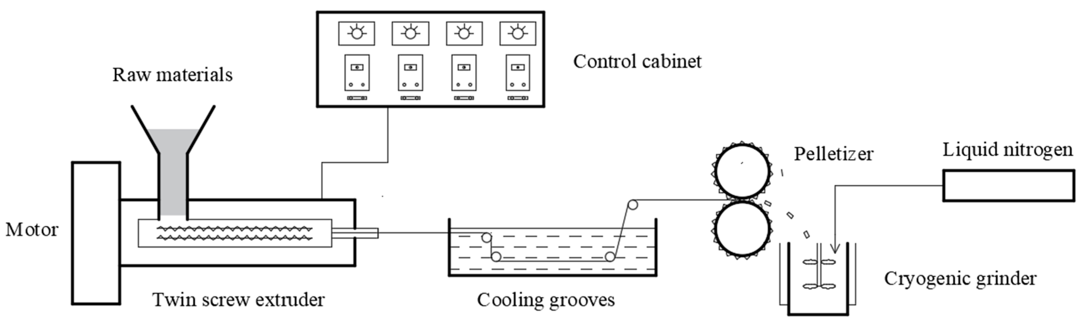 A self-made piece of cryogenic comminution equipment (Figure 1) was employed to prepare PA-12 powder. First the PA-12 was thoroughly dried in a vacuum-drying oven at 80 °C for 2 h, and then it was mixed with POE-g-MAH, ethylene-propylene copolymer, leveling agent, and other additives in a certain proportion. Then, it was added to a twin-screw extruder to obtain a molten sample with temperature of the melting section set to 205–215 °C, then it was solidified in a low-temperature water bath, dried by a blow dryer, and cut by a granulator to obtain modified nylon particles. The proportional composition of the mixture is shown in Table 1. The mass fractions of the leveling agent in the PA-12 sample are 0%, 0.2%, 0.4%, 0.6%, and 0.8%, respectively. Correspondingly, the samples are recorded as A 1, A 2, A 3, A 4, and A 5. The masses of toughener in the sample are 10 g, 20 g, 30 g, and 40 g, respectively. Correspondingly, the samples are recorded as B 1, B 2, B 3, and B 4.
