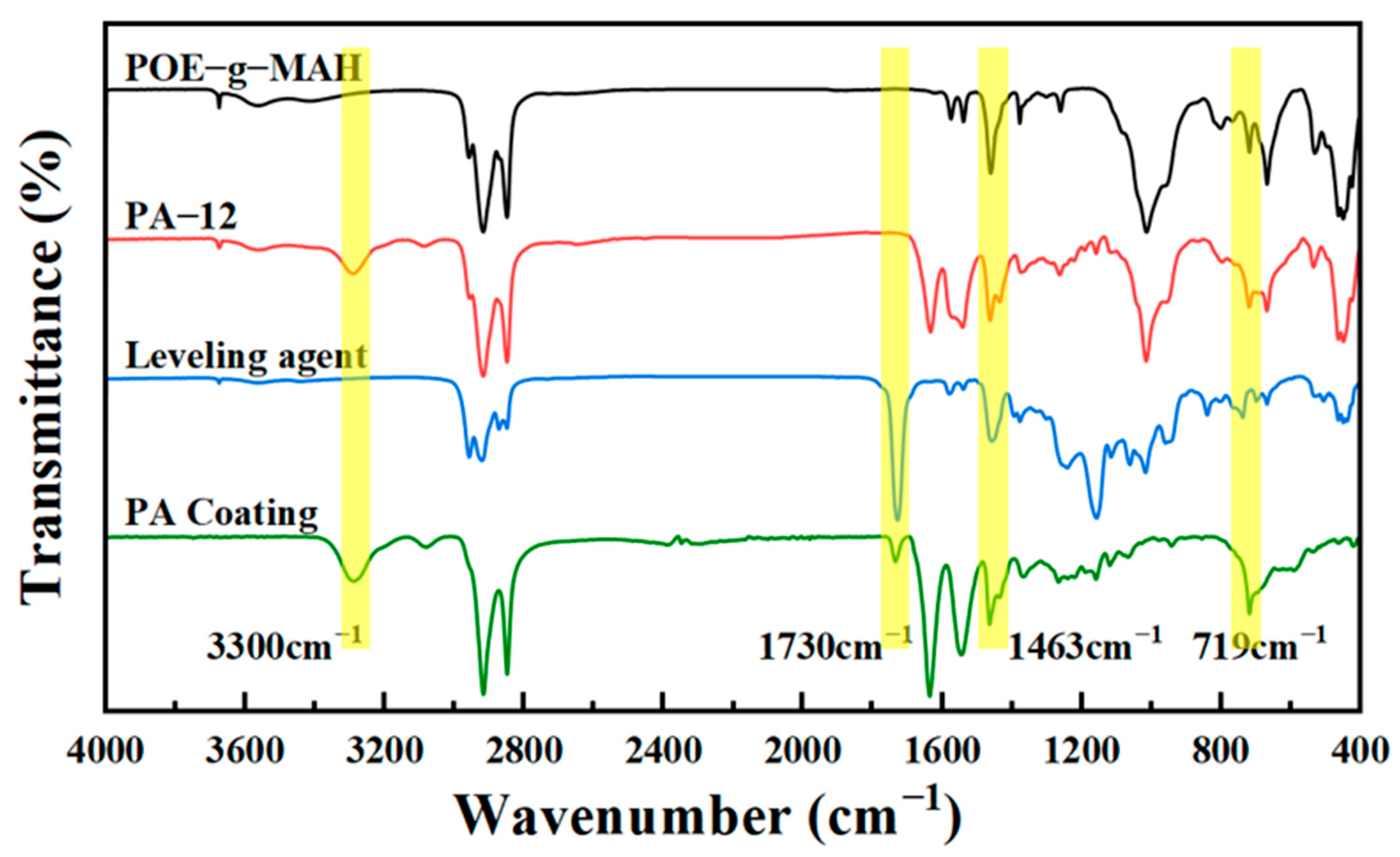 The FT-IR spectra of the prepared PA-12 samples are shown in Figure 2. The spectra of PA-12 and granules of PA-12 powder clearly share the same adsorption peaks at 3300 cm−1, 2938 cm−1, and 2867 cm−1 [24,25,26], which could be assigned to the asymmetric stretching of amino group and methylene group stretching vibrations, respectively. The difference is the presence of a new adsorption peak at 1730 cm−1 in the spectrum of PA-12 powder, which could be attributed to the carbonyl C=O in polyacrylate, which demonstrates the successful introduction of polyacrylate leveling agents into powders. Meanwhile, the infrared spectra of nylon-modified coating and POE-g-MAH were compared, and the absorption peaks of carboxylic acid and dissociative carboxylic acid were observed at 1463 cm−1 and 719 cm−1. The successful access of POE-g-MAH was proved [27]. In summary, it is concluded that the target leveling agent and the target plasticizer (POE-g-MAH) were successfully introduced into the nylon-modified powder coating.