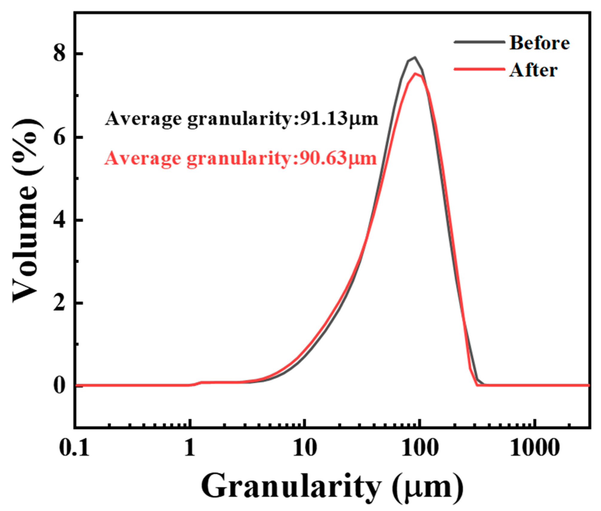 Figure 5. Particle size distribution of PA-12 powder before and after modification.