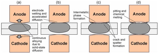 Different stages of electrode degradation: Initial state → continuous alloying of the electrodes/displacement of the weld lens in the anode direction due to the Peltier effect (a); increase in contact resistance → enlargement of the welding lens/melting of the sheet metal surface and wetting of the electrode surface with Al; (b) intermetallic phase formation → crack and spatter formation as a result of further increased contact resistance; (c) expansion of intermetallic phase formation, chemical melting, pitting and finally adhesion of the electrode at the sheet surface (d).