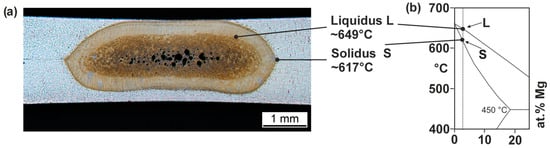 Metallographic microsection of a spot-welded joint, AlMg3 (a), and binary Al-Mg phase diagram (b) that is based on [32].